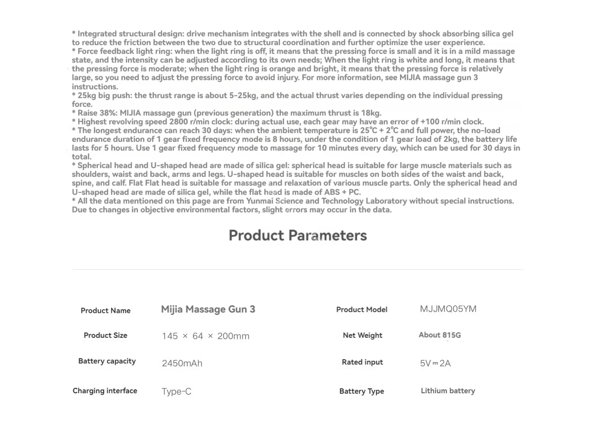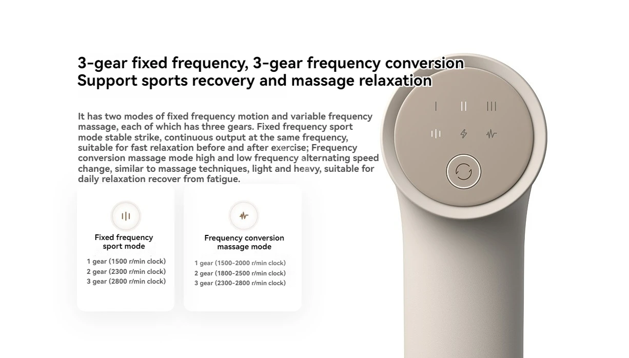 2. In addition, the power performance of this product is also excellent. The maximum speed can reach 2800 rpm, and the striking depth reaches 10mm, which can effectively promote blood circulation and quickly relieve fatigue. At the same time, it also provides two modes: fixed-frequency exercise and variable-frequency massage, and can automatically memorize the gear used last time. When it is turned on, it will default to the same mode and gear, saving the user's time.
